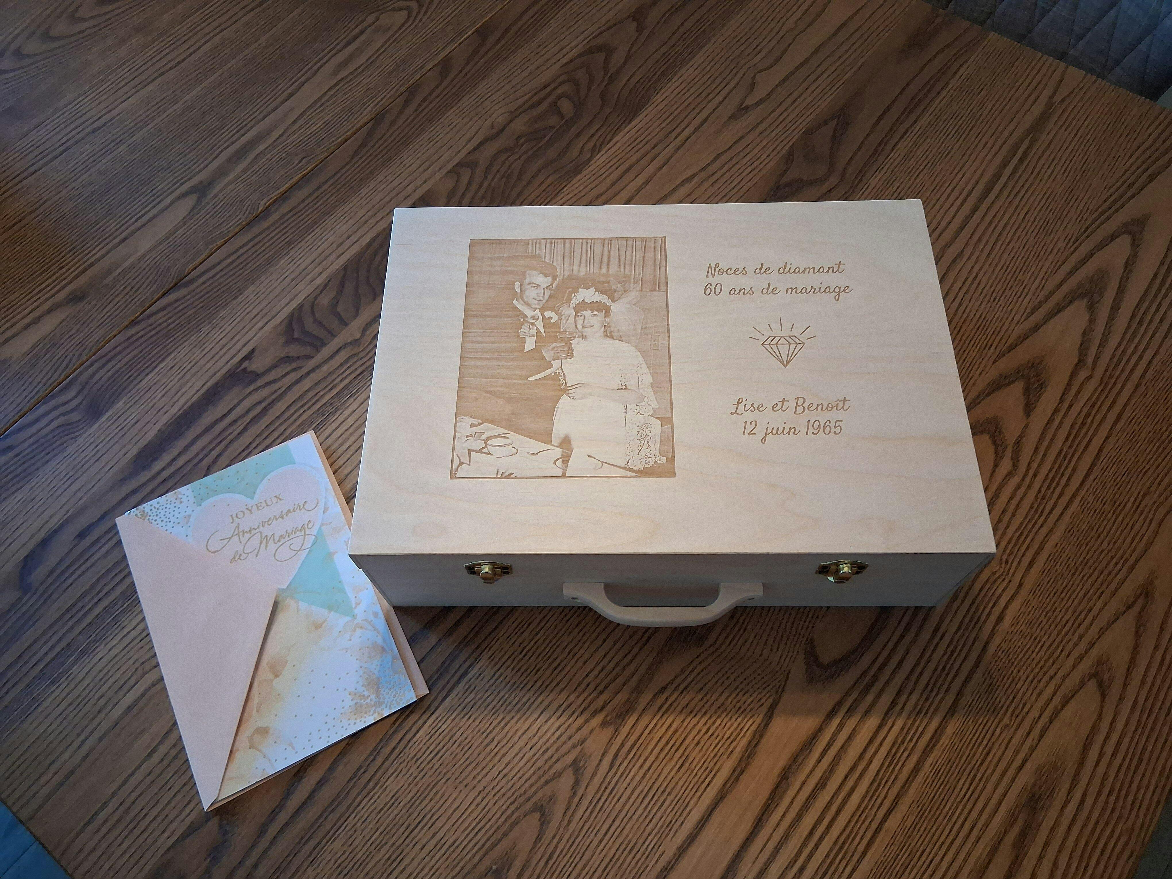 Cette boîte souvenirs offerte pour un 60e anniversaire de mariage a suscité de belles émotions. Une création d'un artiste de coeur; on ne pouvait espérer mieux pour célébrer 60 ans d'amour.🤍💍 Un service hors pair et attentionné.